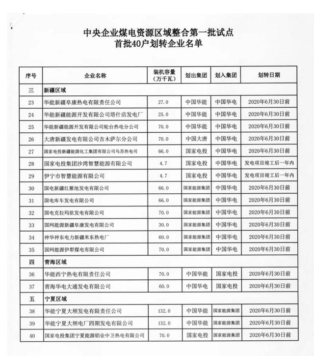 近日,国资委下发《关于印发中央企业煤电资源区域整合第一批试点首批划转企业名单的通知》。文件显示,根据《中央企业煤电资源区域整合试点方案》,目前已就甘肃、陕西、新疆、青海、宁夏5个试点区域48户煤电企业(或项目)整合达成一致意见,其中,38户将于2020年6月30日前划转、2户于发电项目竣工后一年内划转、8户暂不划转(5户煤电一体化项目、2户自备电厂、1户已签订股权转让协议)。