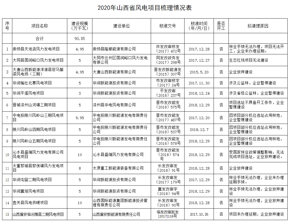 6月2日,山西省能源局公布《2020年山西省风电项目梳理情况》。2020年山西省拟废止项目15个,总规模为90.85万千瓦。