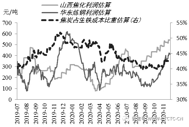 所以,在下游高炉生产未发生持续亏损、秋冬季限产执行力度并不严的前提下,如果年底除山西以外的省份焦化去产能执行不力,且高炉限产、减产力度趋严,那么焦炭涨势将止步于2101合约,价格顶部基本由炼钢利润边际决定。如果年底其他省份去产能力度执行也较好,高炉限产、减产力度不及预期,那么焦炭供不应求状态将延续,且采暖季过后高炉生产也将逐步复苏至高位,对应的就是焦炭涨势延续至2105合约,价格顶部跟随着钢价进一步上移。