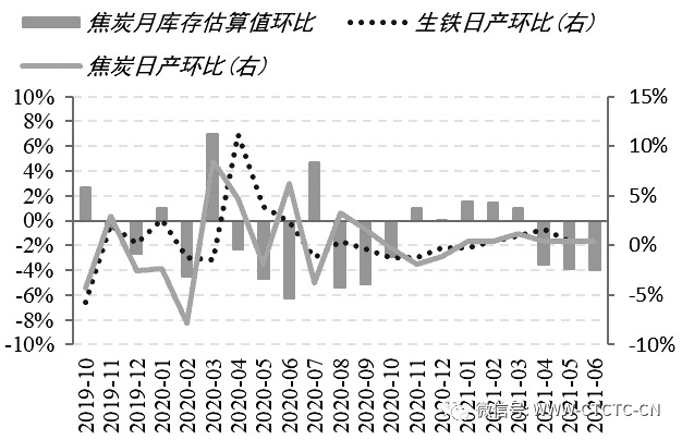 图为生铁、焦炭日产量变动以及焦炭月度库存变动
