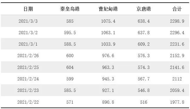 近期北方港口煤炭库存继续向上累积,截至3月3日秦皇岛港、曹妃甸港(国投曹妃甸、曹二期、华能曹妃甸、华电曹妃甸)以及京唐港合计煤炭库存2298.9万吨,较2月22日相比增加321.1万吨。虽然进入3月份以后秦皇岛港煤炭出现小幅回落,但曹妃甸港以及京唐港继续累库,带动北方港整体库存攀升,现阶段供应端相对充足。