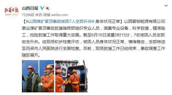 据@山西日报 消息,山西晋柳能源有限公司泰业煤矿冒顶事故救援指挥部组织专业人员,调集专业设备,科学救援,精准施工,抢险救援工作取得重大进展。截至6月18日凌晨5时13分,7名被困人员全部安全升井。经现场初步检查评估,被困人员身体状况正常、情绪稳定,全部转送至吕梁市人民医院进行全面检查。目前,现场救援工作已经结束,事故调查工作随即展开。