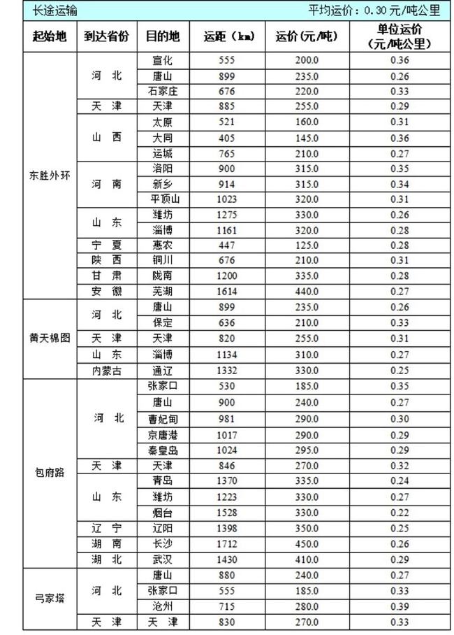 在看完鄂尔多斯主流线路价格行情后,套路君的心凉了半截,尤其是长途运输。从下图表格中我们可以看到,主矿区的长途汽运平均价格为每百公里30元/吨,环比上涨7.14%,同比涨幅15.38%,虽然有小幅度提升,但整体的吨公里运价仍然在3毛左右徘徊。