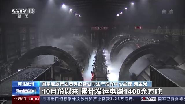 凌晨,国内最大的煤炭下水港——沧州黄骅港,灯火通明,准备装煤的货船在码头边排着队停靠,大型传输设备也昼夜不停地将来自内蒙古等地的煤炭从火车车皮上卸下,再装上船,运往各地。