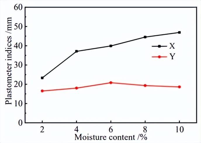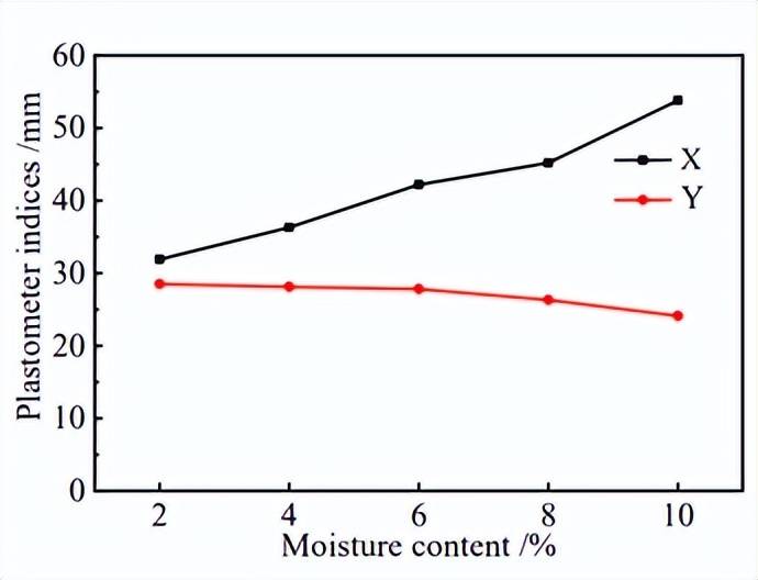 从图5可以看出,随着焦煤水分含量的增加,焦煤的最终收缩度增大,胶质层最大厚度基本不变。由于随着焦煤水分含量的增加,煤料的堆密度减小,煤饼较为疏松,最终收缩度显著增大;水分含量的变化不会改变焦煤的固有性质,胶质层最大厚度基本不变。