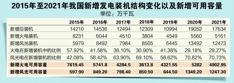 若将总装机量拆分来看,可以看到2015年之后的火电建设速度放缓,且每年新增风光装机都大于火电装机,而且火电在新增装机中的比例从2015年的57.92%,降至2021年的29.27%。