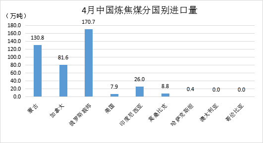其中4月我国共进口炼焦煤426万吨,分国别来看俄罗斯焦煤的进口量为170.7万吨,创下历史最高记录,其次是蒙古国130.8万吨,第三名是加拿大81.6万吨,美国炼焦煤进口量锐减至7.9万吨,已经不复去年风光。