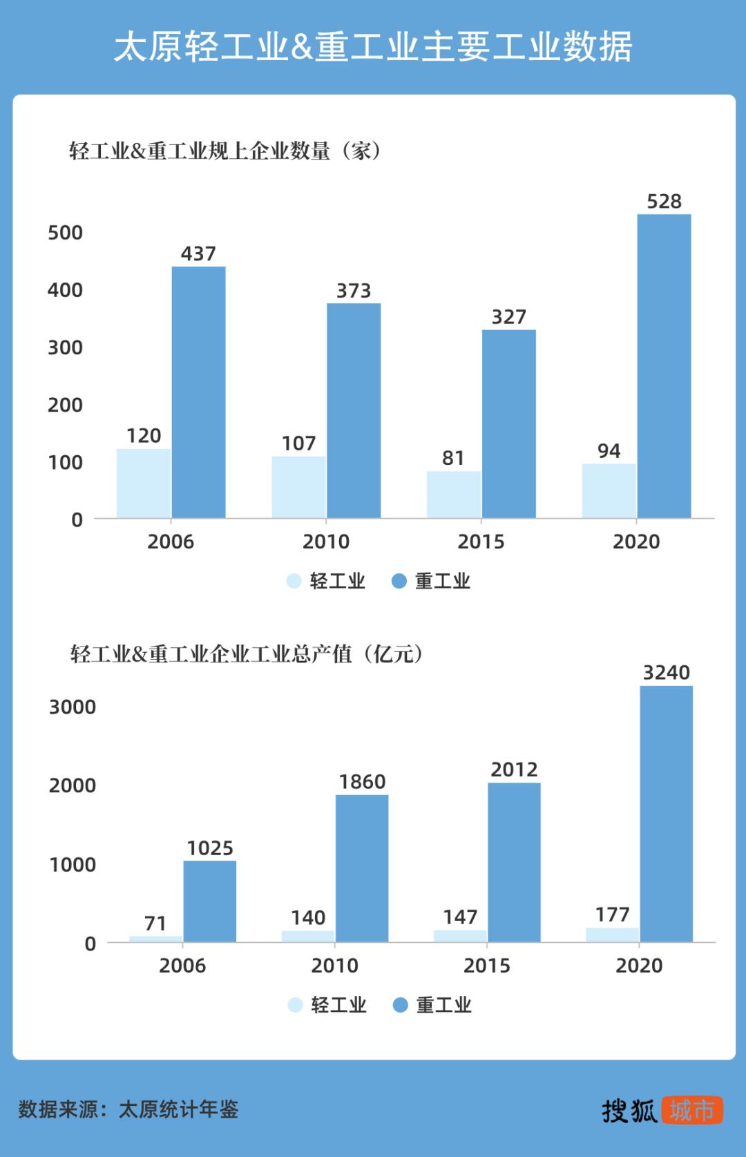 首先,太原长期以来的“一煤独大”,对曾经蓬勃发展的轻工业造成了“挤出”效应;如今太原轻重工业比例失调的现象不仅没有得到明显改善,甚至比转型之初更加严重。2020年末,太原规上工业企业共有622家,其中轻工业94家,重工业528家;规上工业总产值3417亿元,其中轻工业完成177亿元,重工业3240亿元。