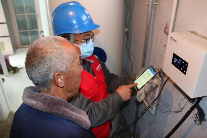 2022年11月,张北县油篓沟供电所工作人员到谢丽成家检查电供暖运行情况。(受访单位供图)