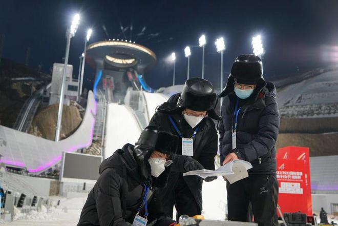 2022年2月,电力工作人员在张家口市崇礼区国家跳台滑雪中心场馆内检查电力设备运行情况。(受访单位供图)