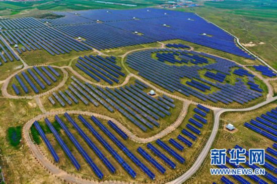 这是位于山西省大同市云州区杜庄乡土井村的以熊猫为造型的光伏电站(无人机照片,2021年8月3日摄)。新华社记者 曹阳 摄